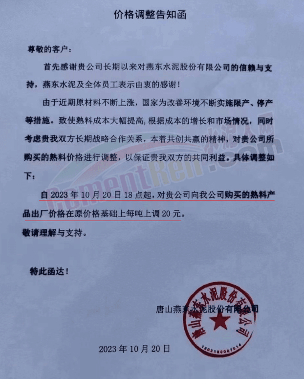 同期,河北唐山冀東水泥、耀東水泥、燕東水泥、燕南水泥、磐石水泥等多家企業(yè)通知上調熟料報價20元/噸。