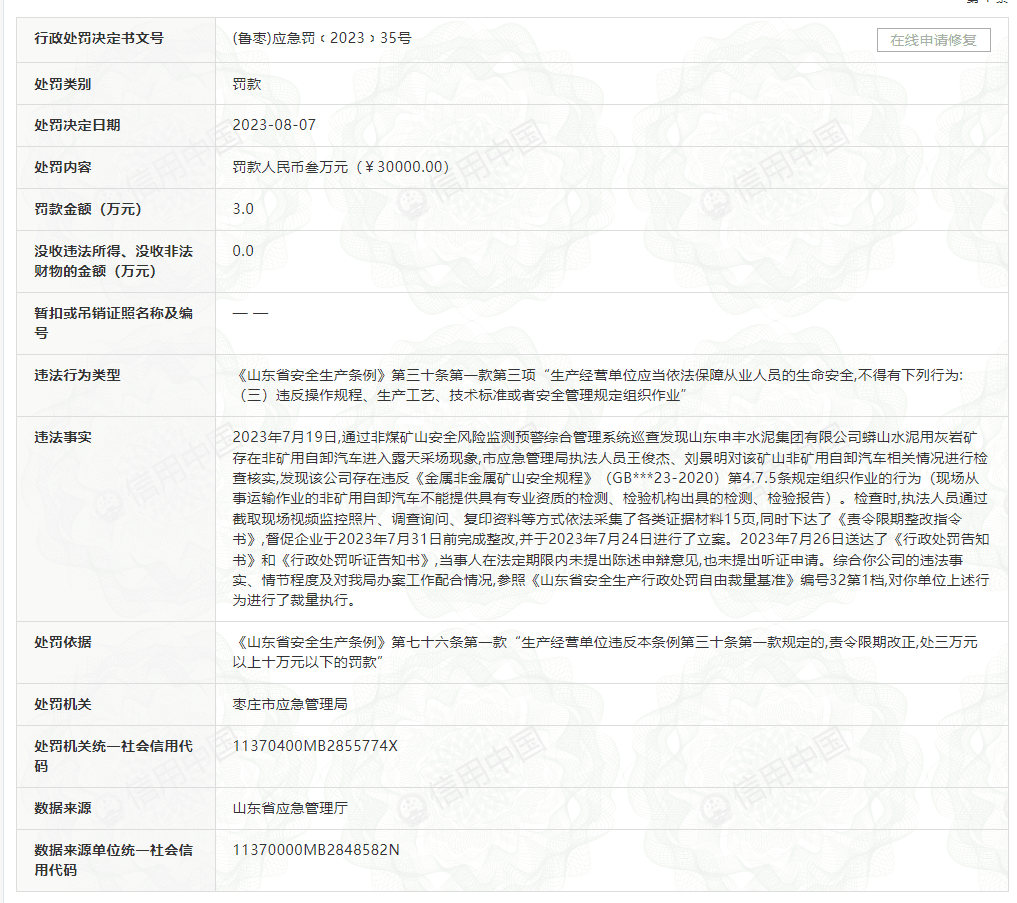 今年8月7日,棗莊市應(yīng)急管理局依據(jù)《山東省安全生產(chǎn)條例》曾對申豐水泥公司處以3萬元罰款。處罰原因為:企業(yè)水泥用灰?guī)r礦存在非礦用自卸汽車進(jìn)入露天采場現(xiàn)象。
