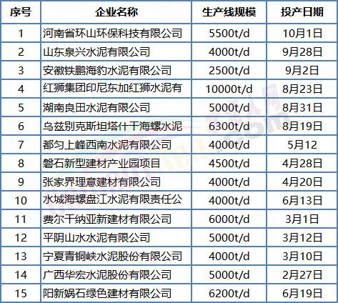 從目前各項(xiàng)目最新動(dòng)態(tài)可見(jiàn),部分在建項(xiàng)目已陸續(xù)點(diǎn)火投產(chǎn),另有部分已開(kāi)工在建項(xiàng)目正加緊建設(shè)中。據(jù)不完全統(tǒng)計(jì)已投產(chǎn)的15個(gè)熟料項(xiàng)目,合計(jì)產(chǎn)能達(dá)2280萬(wàn)噸/年;下半年將投產(chǎn)的5個(gè)項(xiàng)目合計(jì)產(chǎn)能達(dá)810萬(wàn)噸/年,合計(jì)產(chǎn)能達(dá)3090萬(wàn)噸/年。