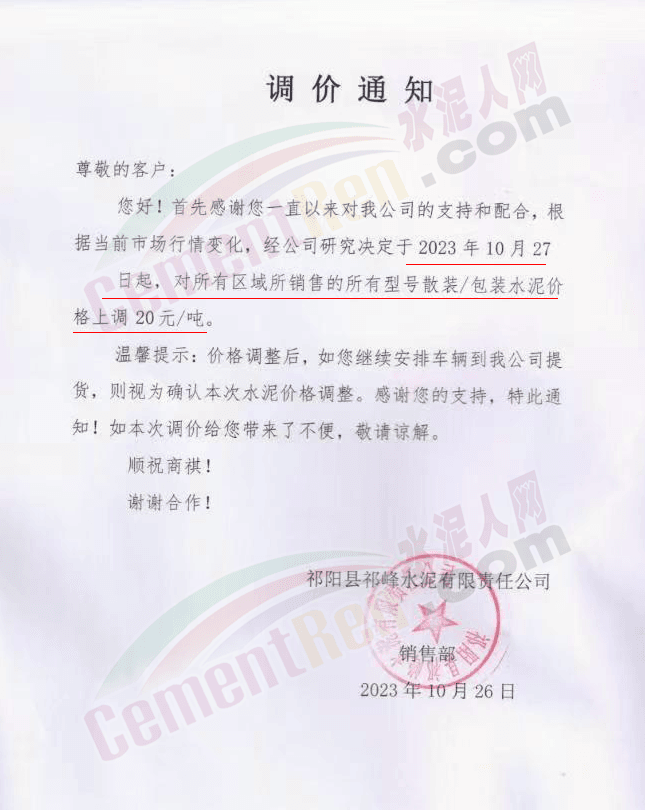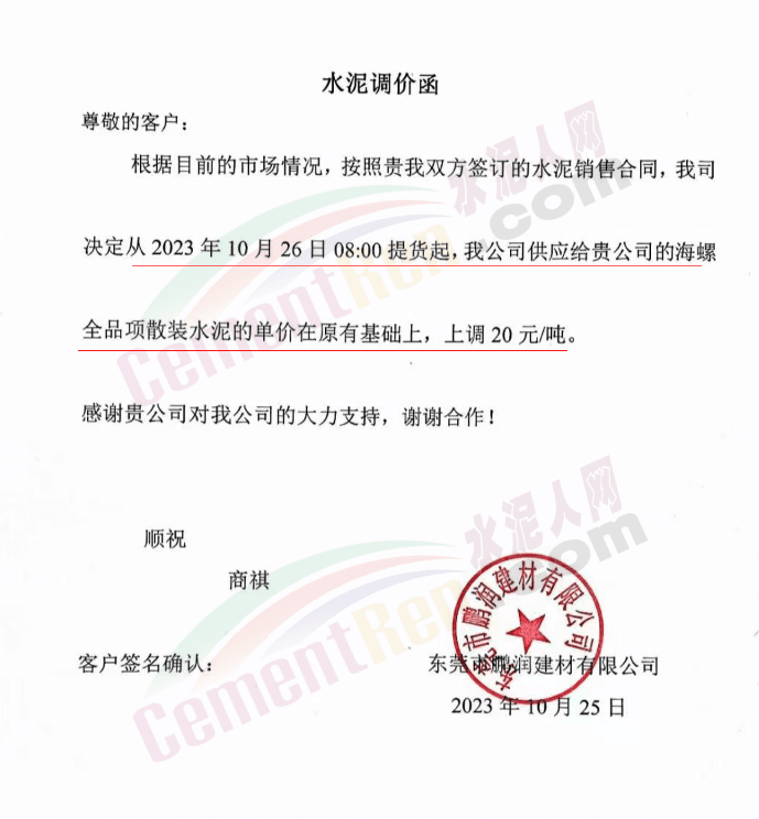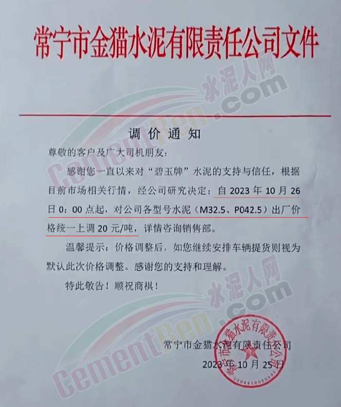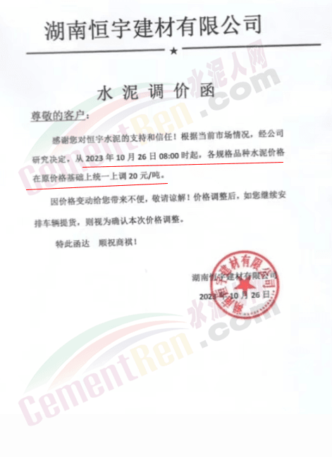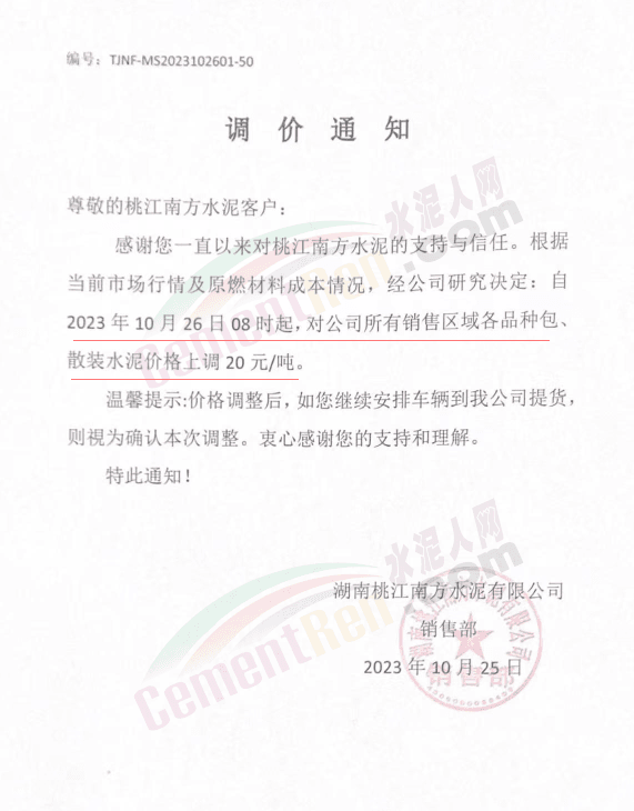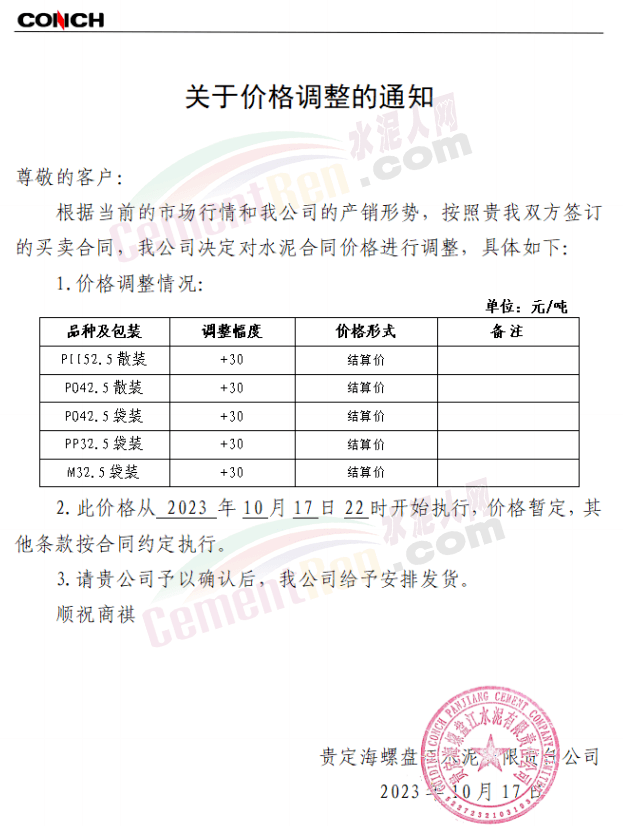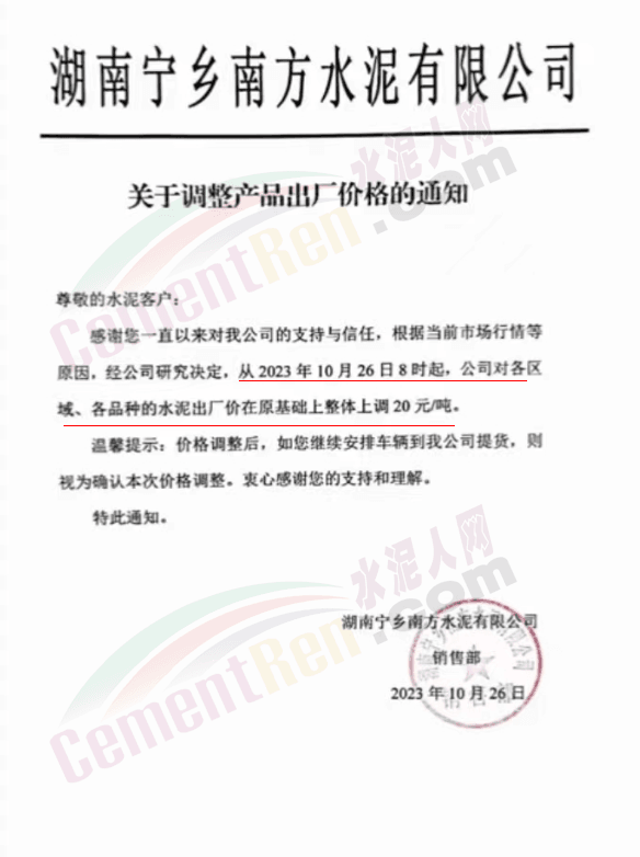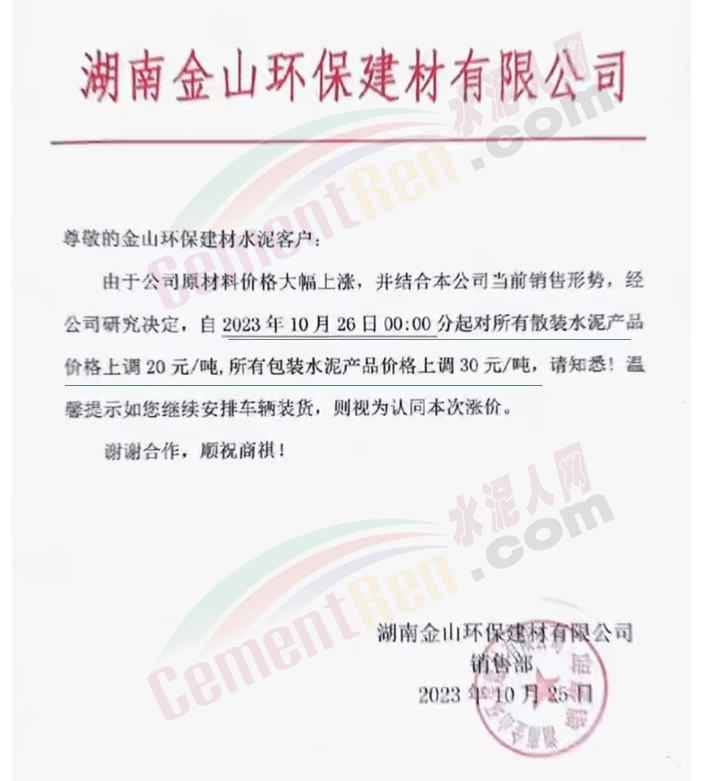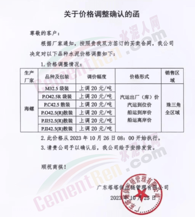 近來(lái)受原材料價(jià)格上漲和經(jīng)濟(jì)政策的刺激,廣東、湖南、山西、陜西多地包括海螺水泥在內(nèi)的多家品牌企業(yè)通知上調(diào)報(bào)價(jià)。廣東東莞鵬潤(rùn)建材有限公司通知,根據(jù)目前的市場(chǎng)情況,從10月26日8時(shí)起公司供應(yīng)的海螺全品項(xiàng)散裝水泥上調(diào)20元/噸。