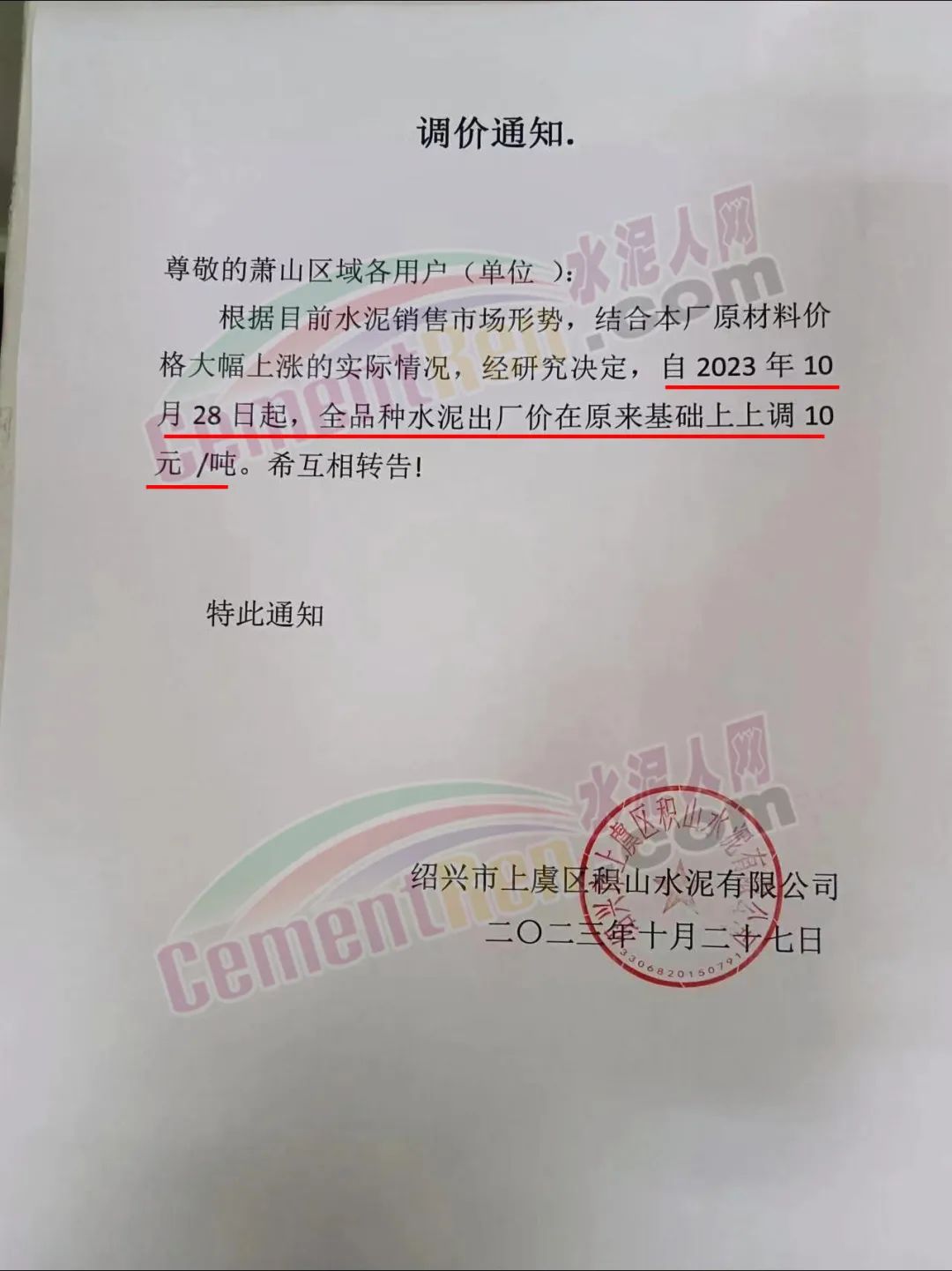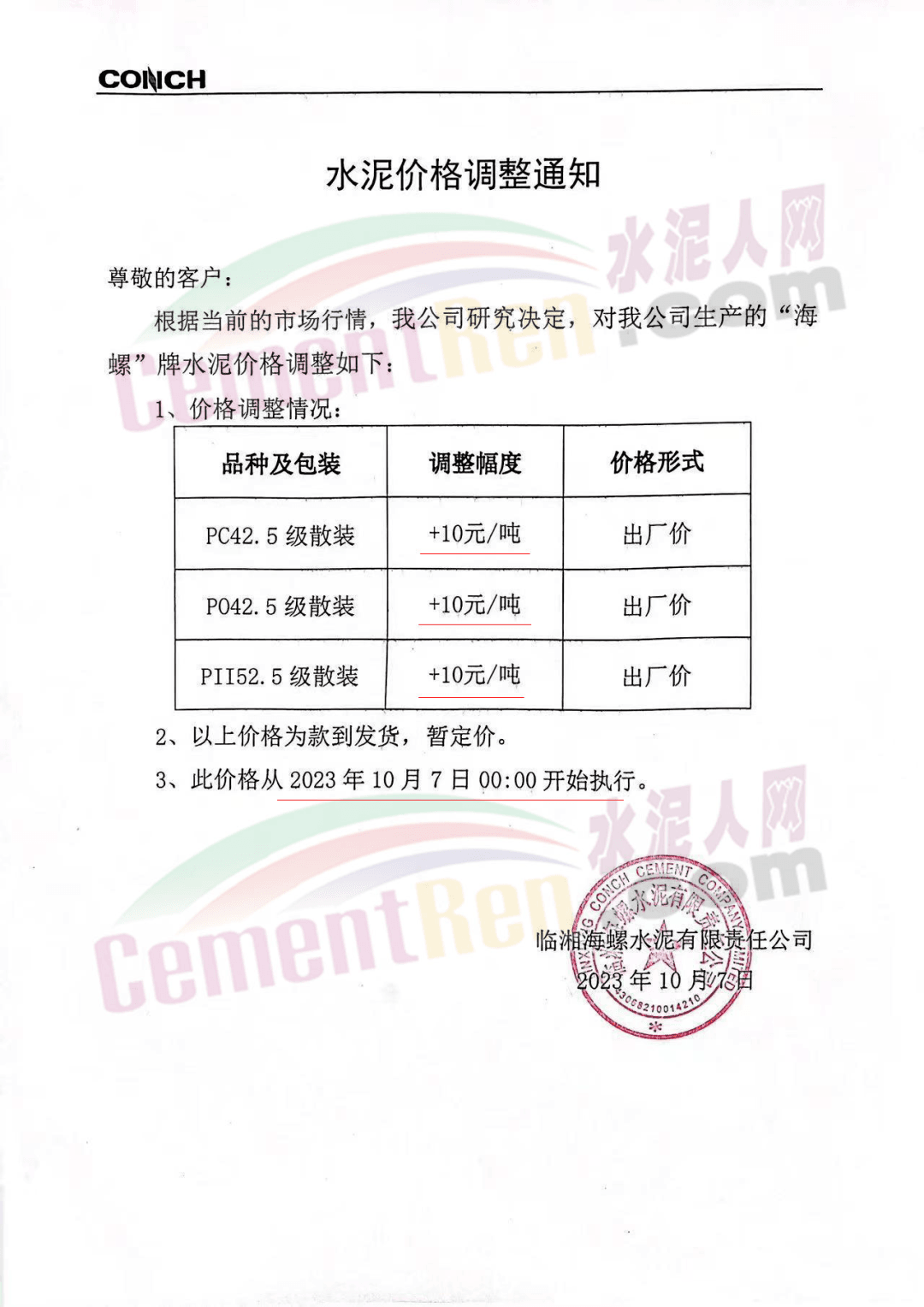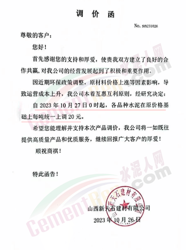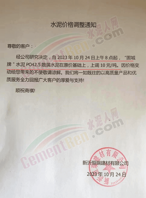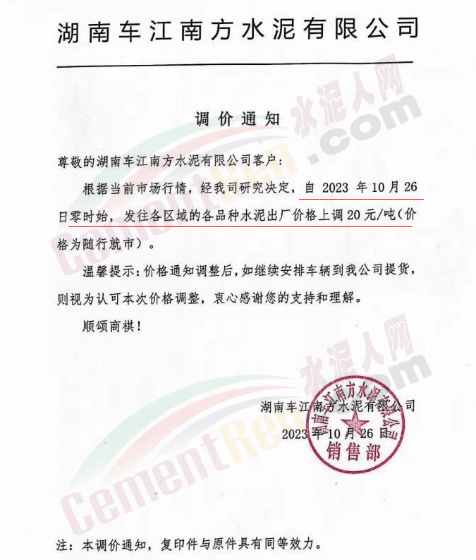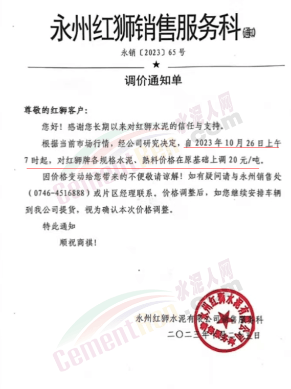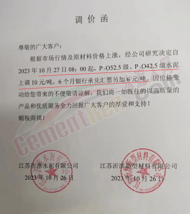 近來(lái)受原材料價(jià)格上漲和經(jīng)濟(jì)政策的刺激,廣東、湖南、山西、陜西多地包括海螺水泥在內(nèi)的多家品牌企業(yè)通知上調(diào)報(bào)價(jià)。廣東東莞鵬潤(rùn)建材有限公司通知,根據(jù)目前的市場(chǎng)情況,從10月26日8時(shí)起公司供應(yīng)的海螺全品項(xiàng)散裝水泥上調(diào)20元/噸。