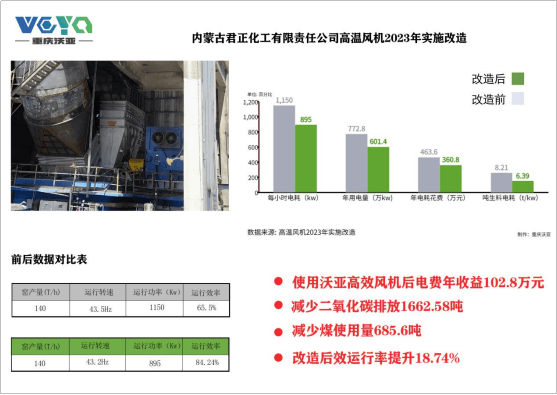 通過高效風(fēng)機(jī)的使用,君正化工的風(fēng)機(jī)運(yùn)行效率提升了18.74%。這意味著公司的生產(chǎn)效率和產(chǎn)能得到了顯著的提升,有助于降低生產(chǎn)成本并滿足市場需求。