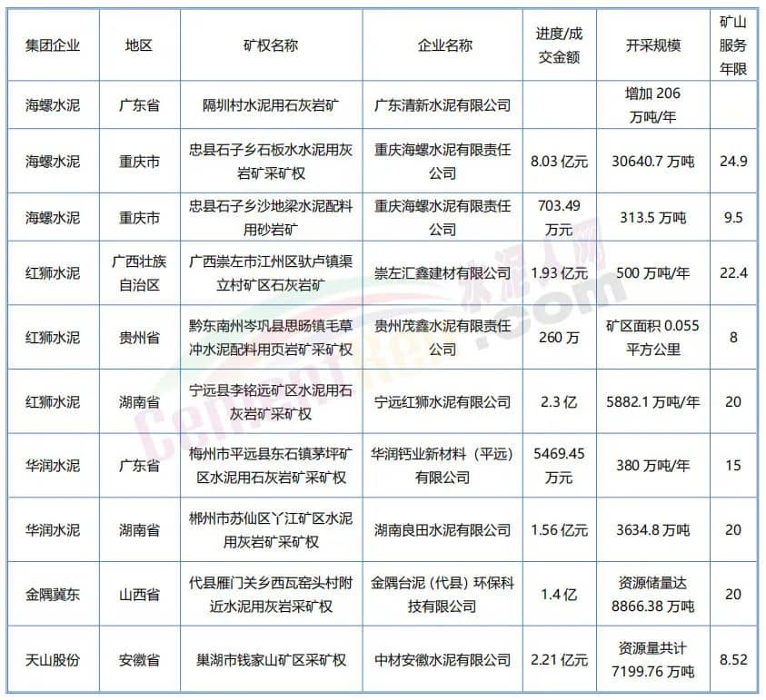 據(jù)水泥人網(wǎng)了解,今年以來行業(yè)頭部企業(yè)海螺水泥、紅獅水泥、金隅冀東、天山股份等企業(yè)均有在各地拿礦,擴(kuò)充現(xiàn)有產(chǎn)能資源。