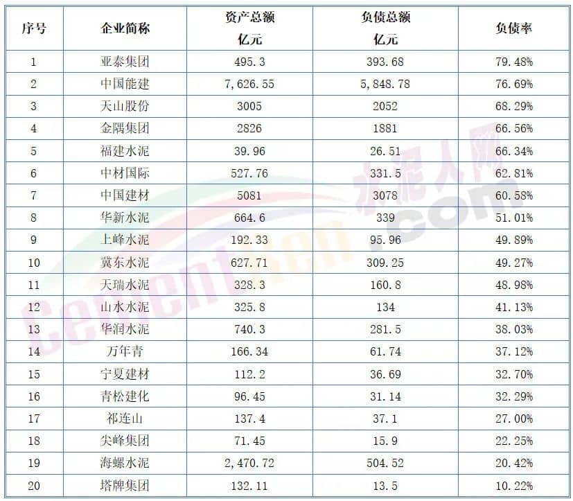 近期水泥行業(yè)各大上市公司先后發(fā)布了今年前三季度業(yè)績報告。其中亞泰集團、中國能建、天山股份、金隅集團、福建水泥、中材國際、中國建材等負債率超過50%。