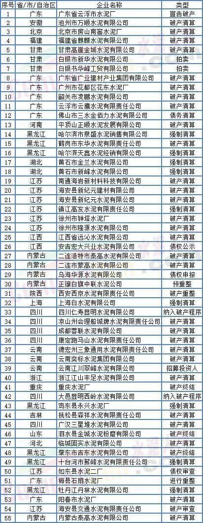 據(jù)水泥人網(wǎng)不完全統(tǒng)計,今年1~10月份已經(jīng)有至少50多家水泥企業(yè)破產(chǎn)。