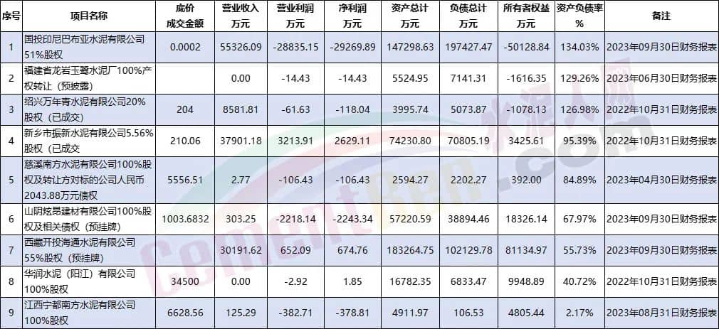 除已宣告破產(chǎn)的企業(yè)外,另有部分企業(yè)公開出讓股權(quán)。其披露信息顯示,資產(chǎn)負債率達100%以上。其中,國投印尼巴布亞水泥有限公司2023年09月30日財務報表顯示,資產(chǎn)負債率達134.03%。海螺水泥持股比例達49%,為其第二大股東。企業(yè)負債總計達19.74億,所有者權(quán)益為-5.01億,51%股權(quán)以2元底價出售。