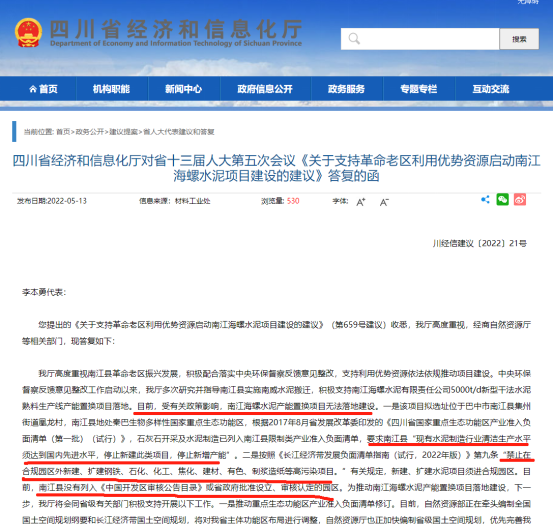 而在2022年5月13日,四川省經(jīng)濟和信息化廳發(fā)布【四川省經(jīng)濟和信息化廳對省十三屆人大第五次會議《關(guān)于支持革命老區(qū)利用優(yōu)勢資源啟動南江海螺水泥項目建設(shè)的建議》答復的函】稱:受有關(guān)政策影響,南江海螺水泥產(chǎn)能置換項目無法落地建設(shè)。