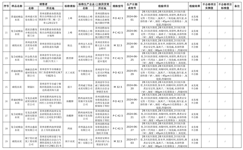本次共對26家銷售者銷售的30批次水泥產品開展了監(jiān)督抽查,,抽查區(qū)域為貴陽市、遵義市、六盤水市、安順市、畢節(jié)市、銅仁市、黔東南州、黔南州、黔西南州。本次監(jiān)督抽查依據GB 175-2023《通用硅酸鹽水泥》等標準進行檢驗。經檢驗,未發(fā)現(xiàn)不合格產品。水泥人網注意到上述抽查的30批次水泥全部來自于流通領域。涉及水泥品牌包含海螺、西南、紅獅、潤豐、臺泥、堯柏、上峰、西部等。抽查水泥品種為普通硅酸鹽水泥、復合硅酸鹽水泥、砌筑水泥三類,其中P.C和P.O水泥抽查標號為42.5.砌筑水泥抽查標號為32.5.
