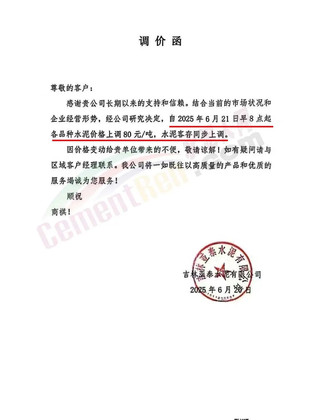 吉林亞泰鼎鹿水泥有限公司通知,結(jié)合當(dāng)前的市場(chǎng)狀況和企業(yè)經(jīng)營(yíng)形勢(shì),經(jīng)公司研究決定,自2025年6月21日早8點(diǎn)起各品種水泥價(jià)格上調(diào)80元/噸,水泥客存同步上調(diào)。