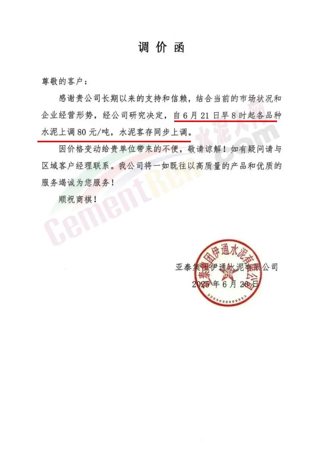 亞泰集團(tuán)伊通水泥有限公司通知,結(jié)合當(dāng)前的市場(chǎng)狀況和企業(yè)經(jīng)營(yíng)形勢(shì),經(jīng)公司研究決定,自6月21日早8時(shí)起各品種水泥上調(diào)80元/噸,水泥客存同步上調(diào)。