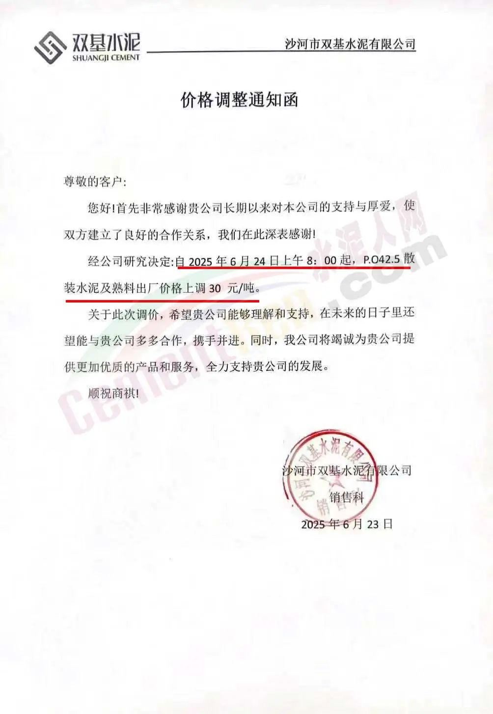 沙河市雙基水泥有限公司通知,經(jīng)公司研究決定自2025年6月24日上午8時(shí)起,P042.5散裝水泥及熟料出廠(chǎng)價(jià)格上調(diào)30元/噸。