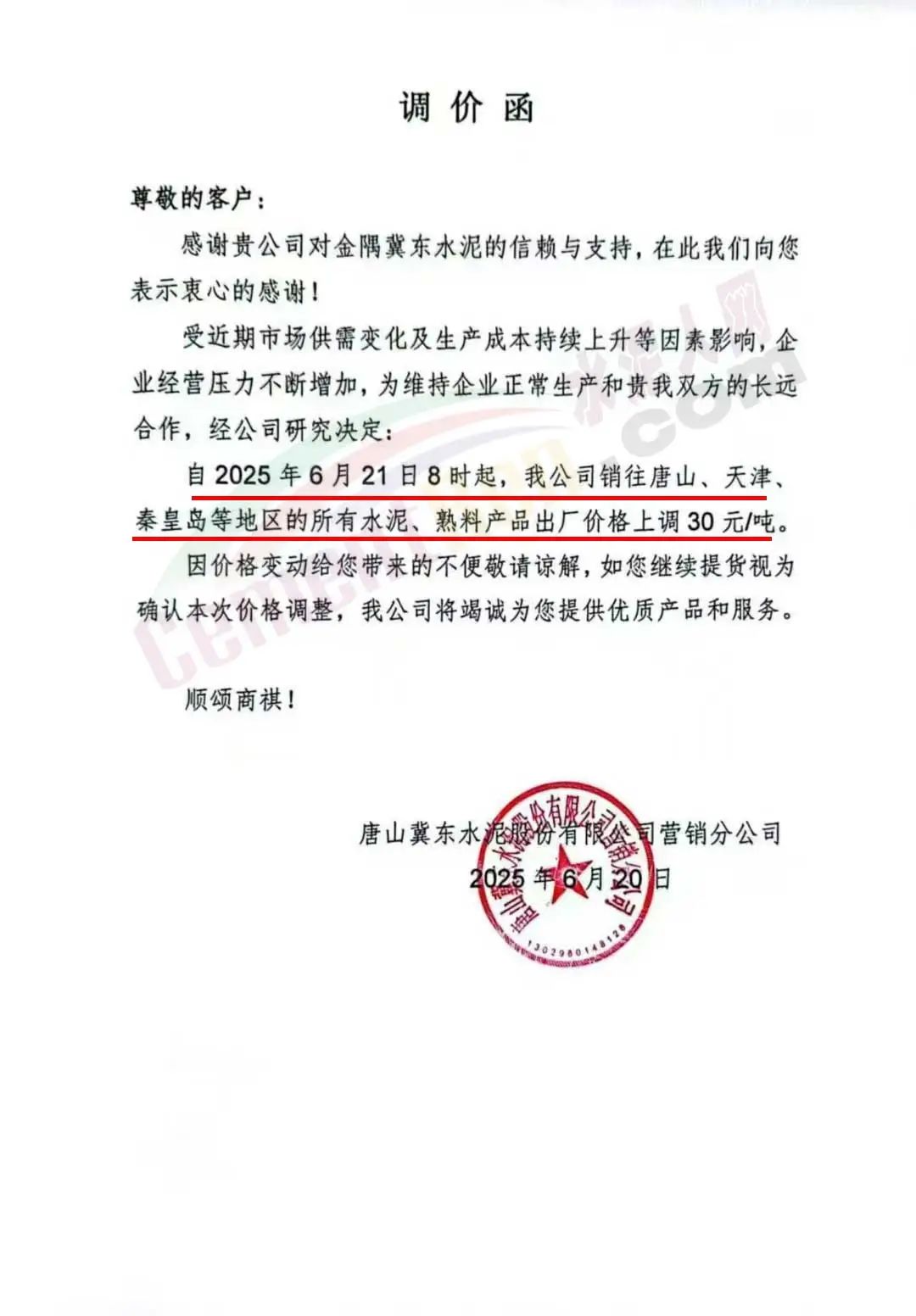 唐山冀東水泥股份有限公司營(yíng)銷(xiāo)分公司通知,受近期市場(chǎng)供需變化及生產(chǎn)成本持續(xù)上升等因素影響,企業(yè)經(jīng)營(yíng)壓力不斷增加,為維持企業(yè)正常生產(chǎn),經(jīng)公司研究決定:自2025年6月21日8時(shí)起,公司銷(xiāo)往唐山、天津、秦皇島等地區(qū)的所有水泥、熟料產(chǎn)品出廠(chǎng)價(jià)格上調(diào)30元/噸。