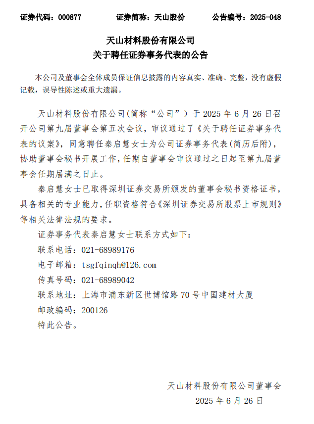 天山股份6月26日晚間發(fā)布公告稱,公司審議通過了《關于聘任證券事務代表的議案》,同意聘任秦啟慧女士為公司證券事務代表,協(xié)助董事會秘書開展工作。