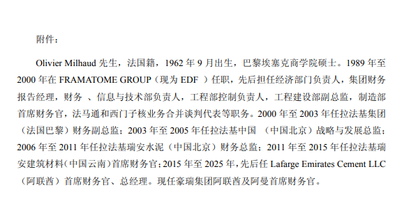 6月25日,華新水泥發(fā)布公告稱,經(jīng)公司董事會會議審議并投票表決,選舉Olivier Milhaud為公司第十一屆董事會董事,任期與本屆董事會一致。根據(jù)公告,Olivier Milhaud,法國籍,1962年9月出生,巴黎埃塞克商學院碩士。
